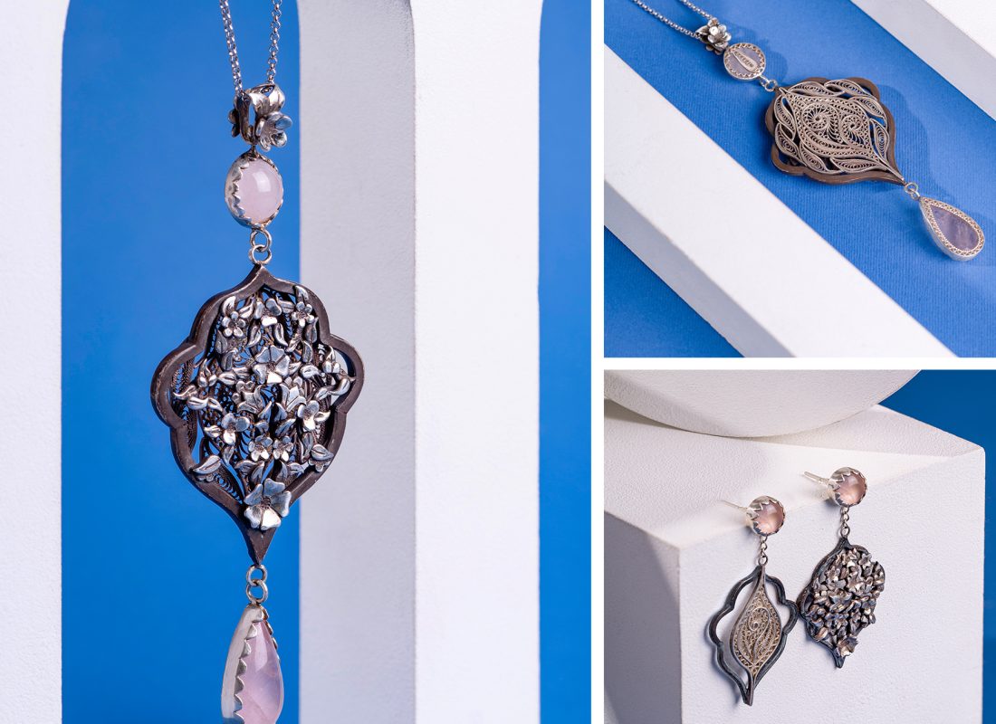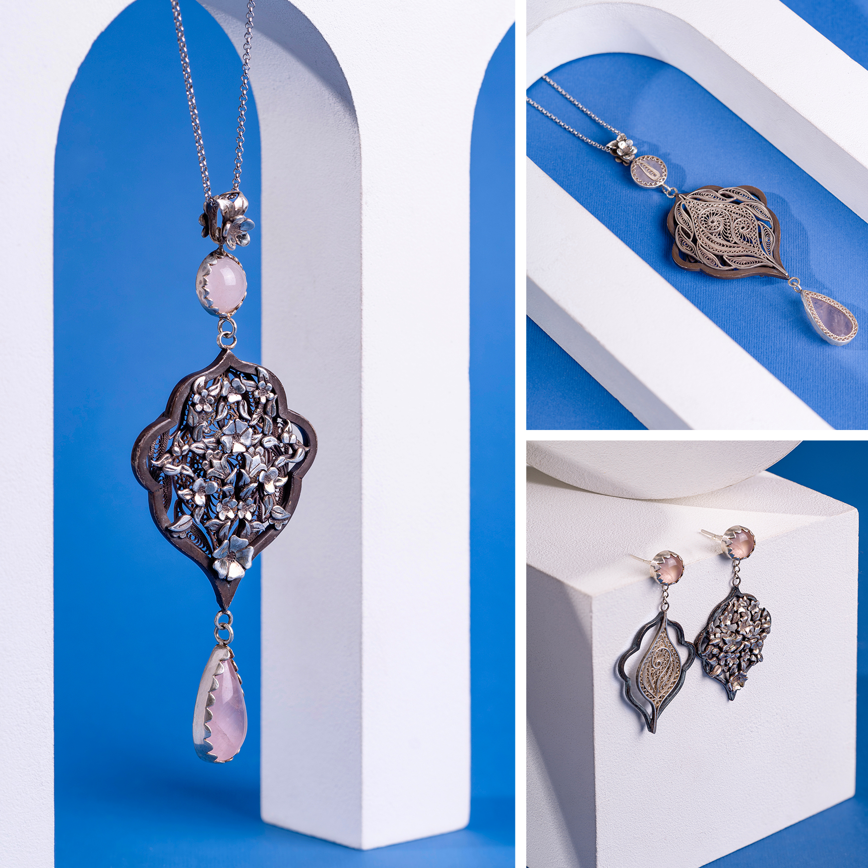 Description: درخت سرو با قامت استوار و برگ های همیشه سبز، نماد پایداری و جاودانگی است. در برابر گذر زمان و تندبادهای روزگار ایستاده و تجسمی از زندگی ابدی و عشق بی پایان به شمار می آید. سرو، نماد آزادگی و قدرت است که در برابر سختی ها سر خم نمی کند و آرزوهای بلند را در دل می پروراند. در این اثر، نقوش ختایی بر نقره نقش بسته اندو باغی از گل را به نمایش میگذارند. در پس این گل ها، در تاریکی باغ، سروی تنها قد برافراشته و در سکوت، نغمه ای دلنشین می خواند که طنین آن در خاموشی شب می پیچد. جنس: نقره، رزکوارتز سال ساخت: 1402