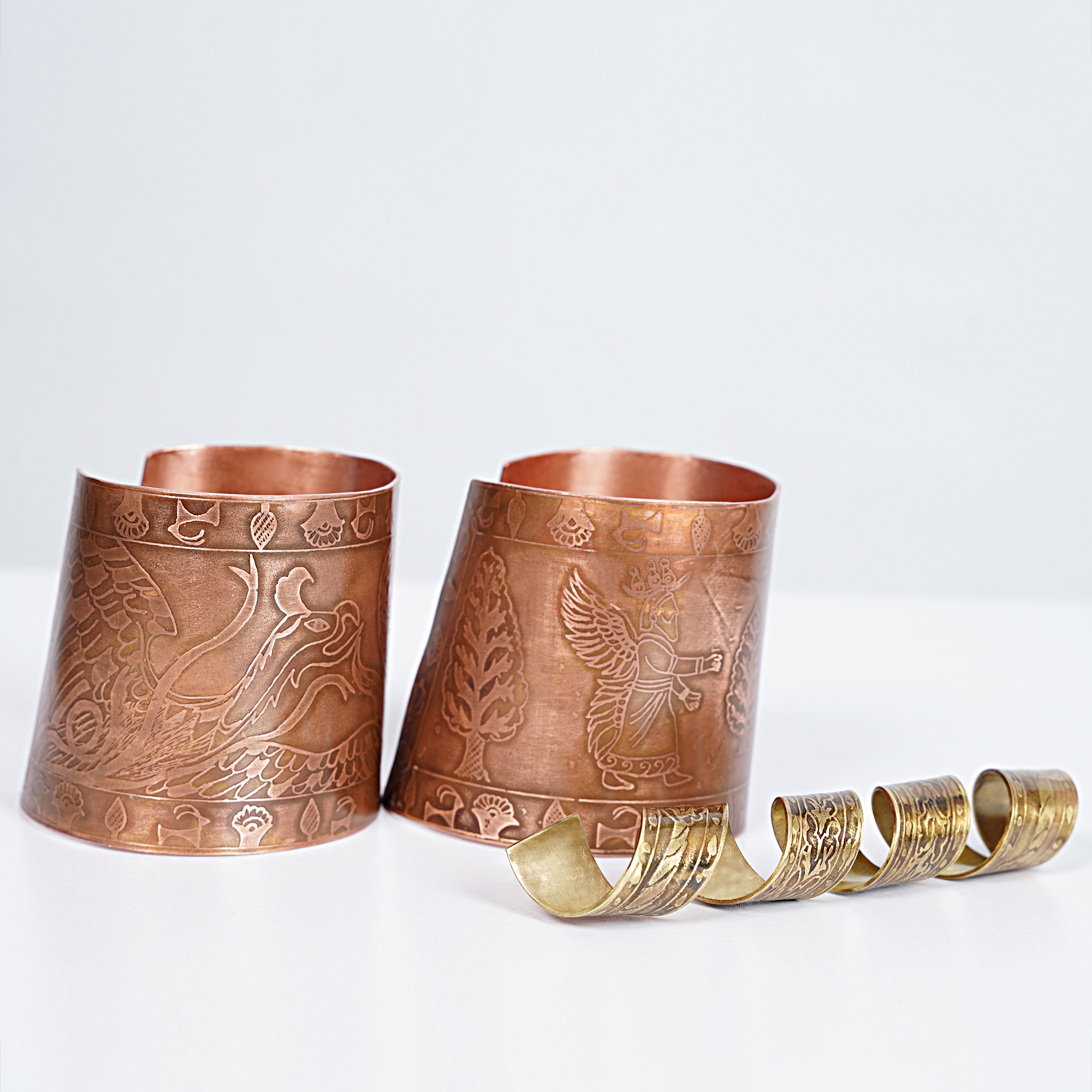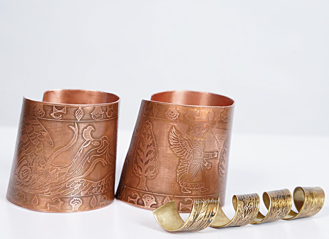 یک ست سه تکه نقالی شامل دو مچبند و دسته چوبدستی با نقوش الهام گرفته از نبرد خیر و شر و درخت سرو جنس: مس و برنج تکنیک: اچینگ فلز
