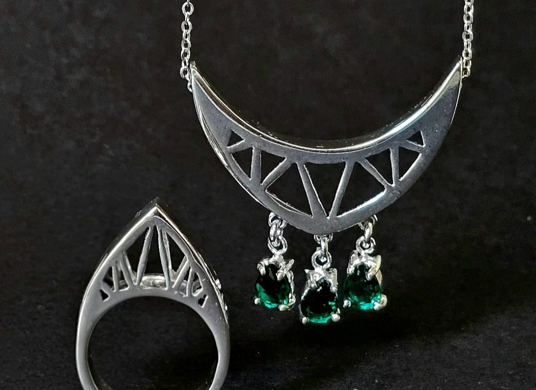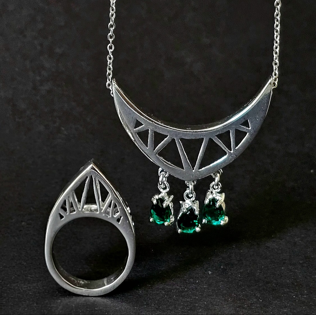 Description: سبک آرتدکو یکی از جنبشهای مهم هنری و طراحی در قرن بیستم به حساب میآید که تأثیر گستردهای در حوزههای مختلفی مثل معماری، هنرهای تجسمی، طراحی داخلی، مُد و جواهرات داشته است. طرحهای پیشرو مجموعهای از زیورآلات هستند که به وضوح از هندسه و الگوهای تکرارشوندهی سبک آرتدکو الهام گرفتهاند. در نگاه اول، استفاده از خطوط صاف، اشکال هندسی منظم مانند ششضلعیها و لوزیها، و ترکیب آنها با موادهای متفاوت مثل برنج، مس و سنگهای قیمتی دیده میشود. این ویژگیها دقیقاً همان چیزی هستند که آرتدکو را از دیگر سبکها متمایز میکند: ترکیبی از نظم هندسی با جلوة لوکس و چشمگیر. در بعضی طرحها حتی بافتها یا نقوش اسلیمی بهطور انتزاعی بازطراحی شدهاند تا با زبان بصری آرتدکو همخوان شوند. حلقه و آویز ساده با نقوش مثلثی، حس شکوه و تقارن که با الهام از ساختمان کرایسلر ساخته شده با سبک آرتدکو در نیویورک ساخته شده است، این نیم ست به عنوان معماری به مثابه زیور محسوب میشود. این نیم ست از جنس برنج و آبکاری نقره، به صورت حجمی و مخراجکاری سنگها ساخته شده است.