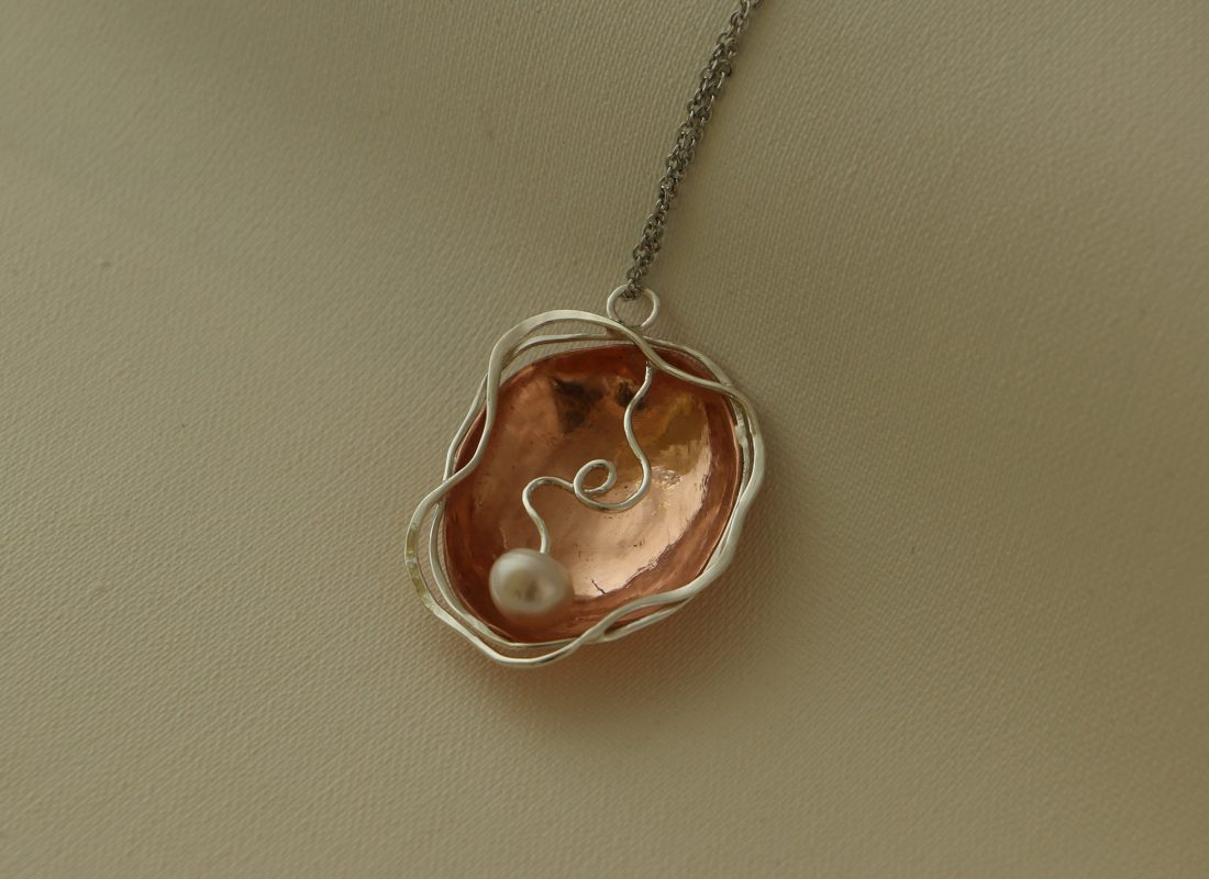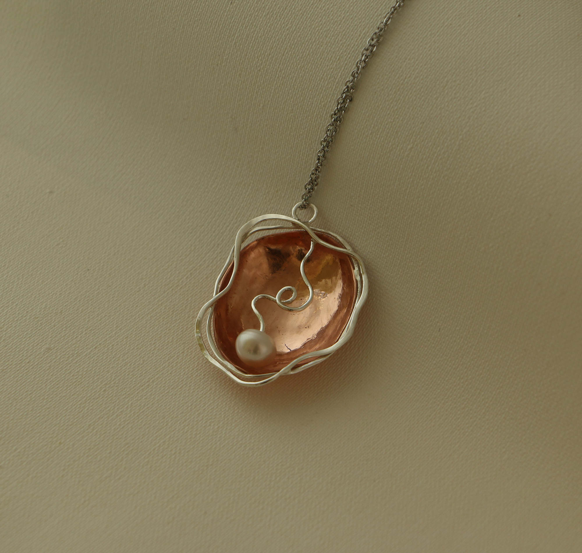 Description: This collection is a personal and emotional exploration of birth, creation, and human connection. It is inspired by the release of oxytocin, the moment when the body begins labor and at the same time forms the first deep bond between mother and child. Silver and copper are chosen as contrasting yet complementary materials. Silver represents purity, calm, and inner growth, while copper embodies warmth, care, and the pulse of life. The interaction between these metals creates a rhythm of contraction and expansion, closeness and separation, reflecting the physical and emotional process of birth itself. Through organic forms, soft curves, and the presence of pearls, the pieces reflect an inner journey from dependence to release. Each work represents a stage of the life cycle, from the womb and umbilical connection to the embrace and the moment of becoming independent. These pieces are not mere ornaments but intimate reflections on connection and freedom, on how love both holds and lets go. Bound to Bloom speaks of the beauty found in attachment, and the strength that lies in letting go.