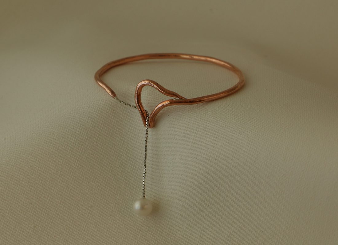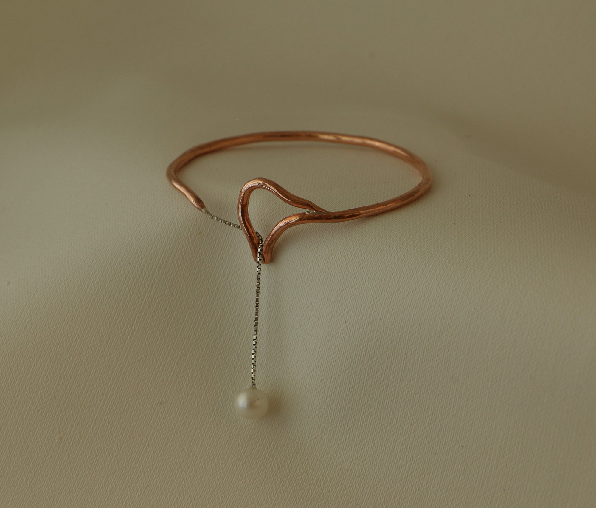 Description: This collection is a personal and emotional exploration of birth, creation, and human connection. It is inspired by the release of oxytocin, the moment when the body begins labor and at the same time forms the first deep bond between mother and child. Silver and copper are chosen as contrasting yet complementary materials. Silver represents purity, calm, and inner growth, while copper embodies warmth, care, and the pulse of life. The interaction between these metals creates a rhythm of contraction and expansion, closeness and separation, reflecting the physical and emotional process of birth itself. Through organic forms, soft curves, and the presence of pearls, the pieces reflect an inner journey from dependence to release. Each work represents a stage of the life cycle, from the womb and umbilical connection to the embrace and the moment of becoming independent. These pieces are not mere ornaments but intimate reflections on connection and freedom, on how love both holds and lets go. Bound to Bloom speaks of the beauty found in attachment, and the strength that lies in letting go.