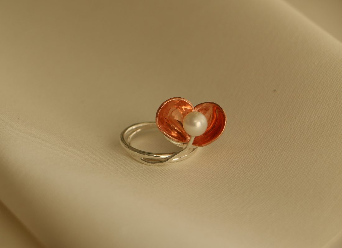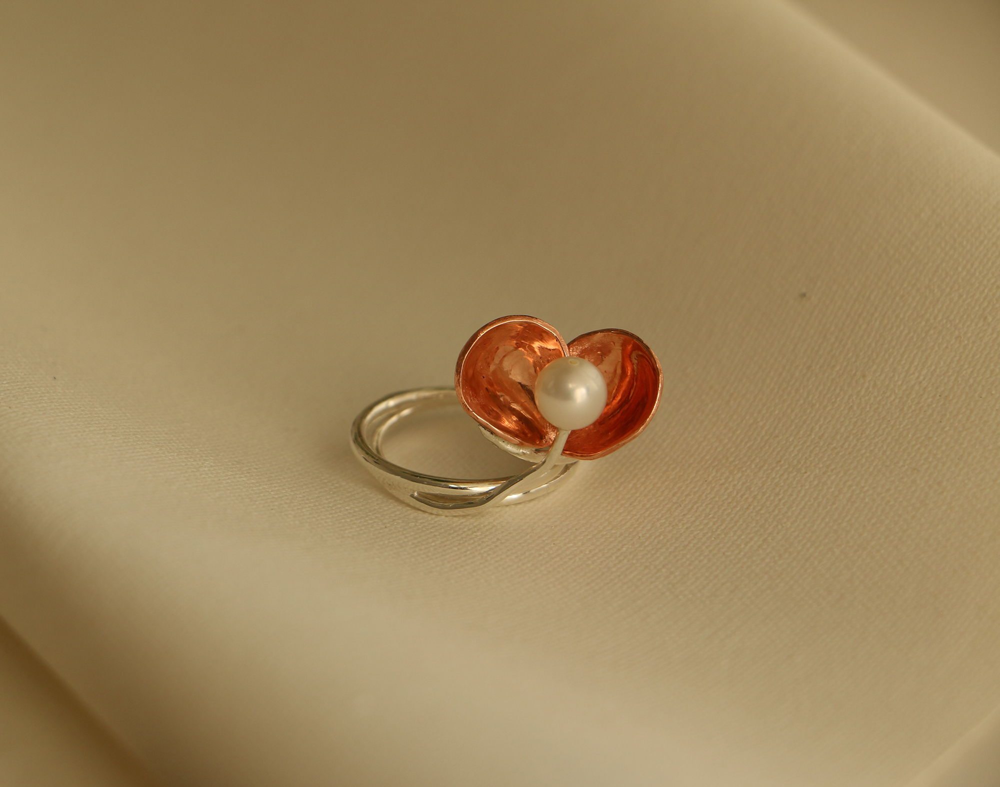 Description: This collection is a personal and emotional exploration of birth, creation, and human connection. It is inspired by the release of oxytocin, the moment when the body begins labor and at the same time forms the first deep bond between mother and child. Silver and copper are chosen as contrasting yet complementary materials. Silver represents purity, calm, and inner growth, while copper embodies warmth, care, and the pulse of life. The interaction between these metals creates a rhythm of contraction and expansion, closeness and separation, reflecting the physical and emotional process of birth itself. Through organic forms, soft curves, and the presence of pearls, the pieces reflect an inner journey from dependence to release. Each work represents a stage of the life cycle, from the womb and umbilical connection to the embrace and the moment of becoming independent. These pieces are not mere ornaments but intimate reflections on connection and freedom, on how love both holds and lets go. Bound to Bloom speaks of the beauty found in attachment, and the strength that lies in letting go.