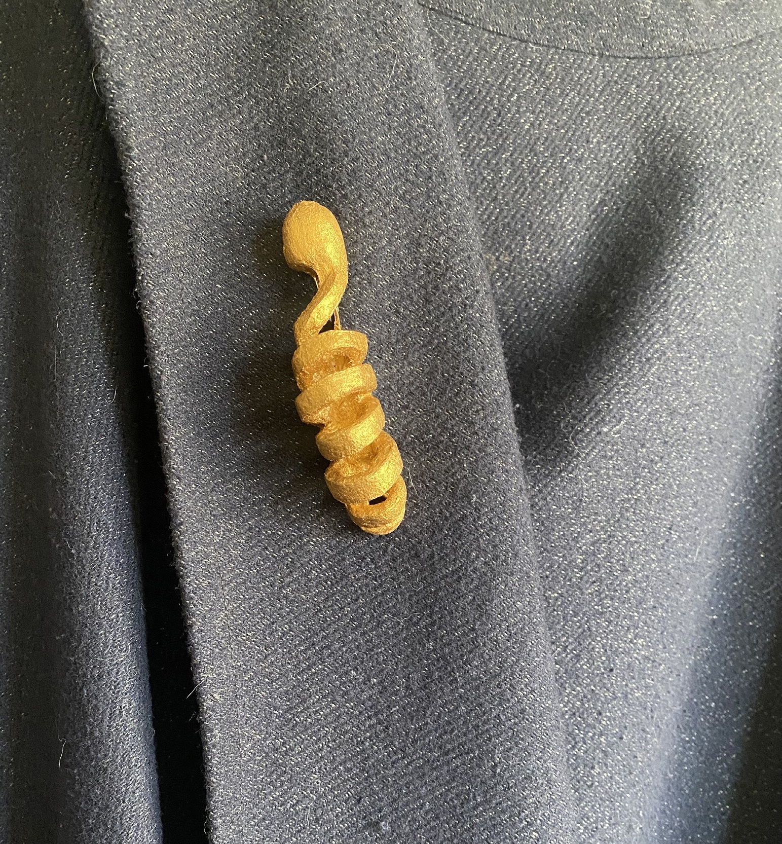 Description: The jewelry pieces I have designed and crafted are based on two fundamental design approaches: one derived from geometric forms and the other from abstract shapes. At first glance—whether in photographs or in person—they appear to be made of a golden-colored metal alloy. Yet, in reality, they are something entirely different. These handcrafted works, which share many structural similarities with sculpture, are what I call wearable sculptures. Contrary to what one might assume, they are not made of any metal or alloy. Instead, they are created from a paste made of human waste materials. My intention in creating these works is twofold: first, to draw attention to the importance of environmental preservation; and second, to demonstrate that waste can be reintroduced into the cycle of production—not merely as utilitarian or recycled objects, but as aesthetic creations that can adorn the human body just like conventional jewelry. In simpler terms, humanity has failed to significantly reduce its waste production, and this failure gravely threatens our planet. If we cannot lessen our waste, perhaps we can transform it—wear it around our necks, or reshape it into other useful objects—so that, in doing so, this Earth might breathe again, even if only a little.