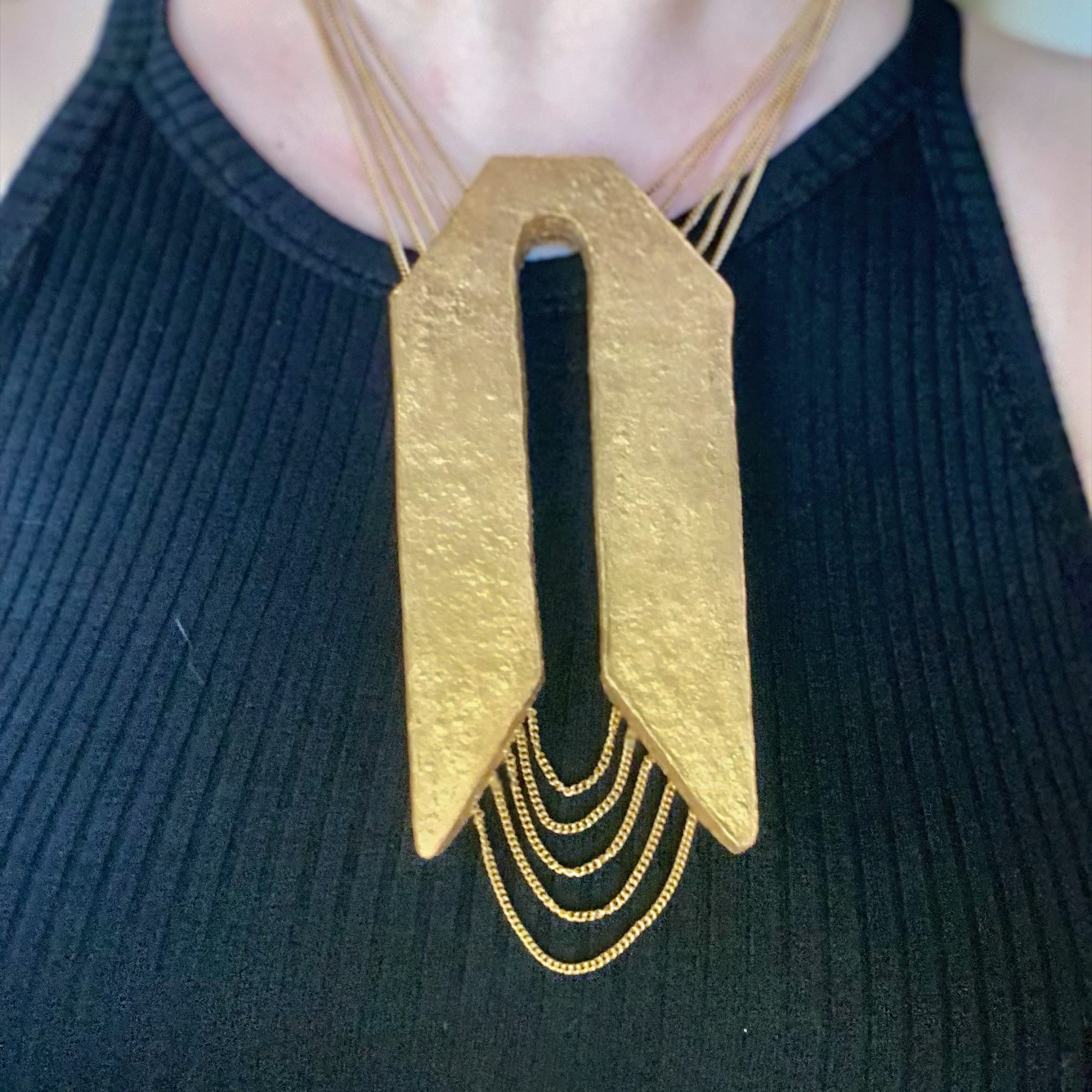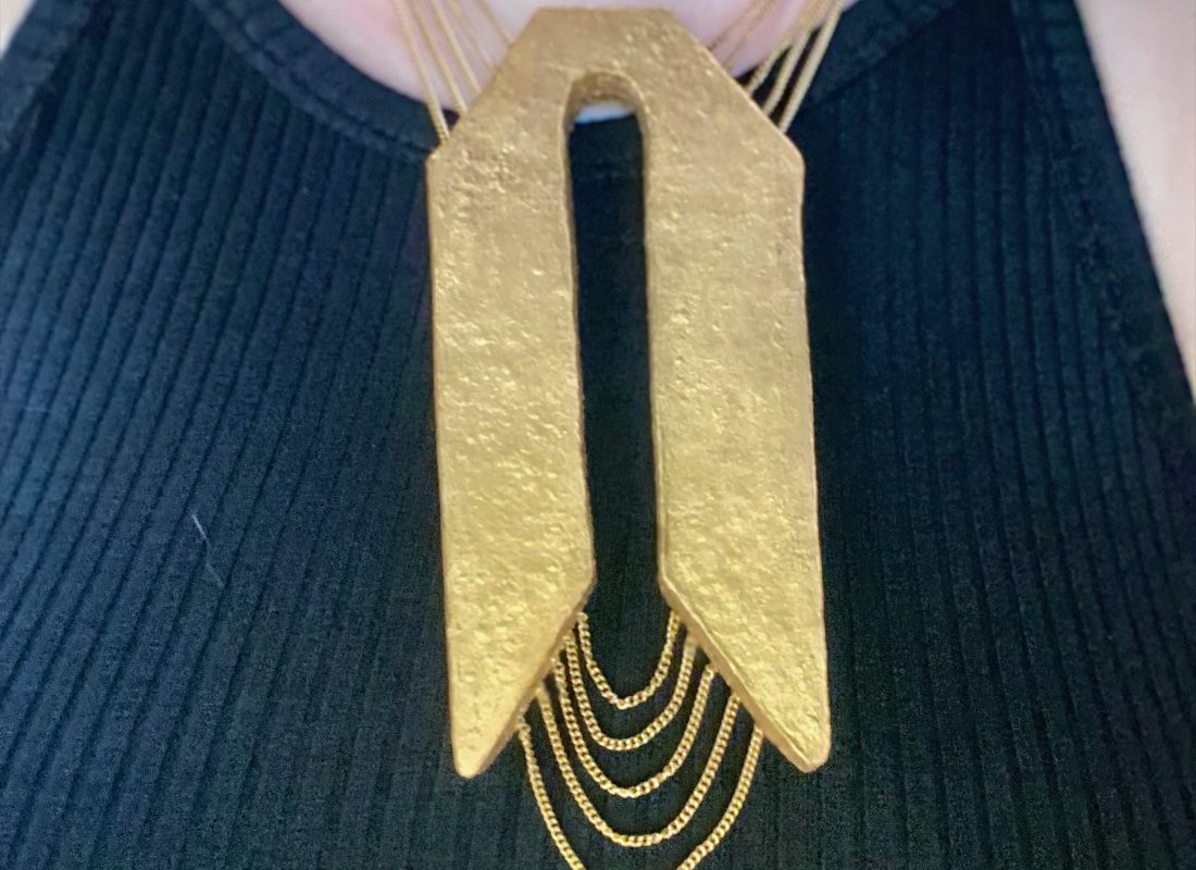 Description: The jewelry pieces I have designed and crafted are based on two fundamental design approaches: one derived from geometric forms and the other from abstract shapes. At first glance—whether in photographs or in person—they appear to be made of a golden-colored metal alloy. Yet, in reality, they are something entirely different. These handcrafted works, which share many structural similarities with sculpture, are what I call wearable sculptures. Contrary to what one might assume, they are not made of any metal or alloy. Instead, they are created from a paste made of human waste materials. My intention in creating these works is twofold: first, to draw attention to the importance of environmental preservation; and second, to demonstrate that waste can be reintroduced into the cycle of production—not merely as utilitarian or recycled objects, but as aesthetic creations that can adorn the human body just like conventional jewelry. In simpler terms, humanity has failed to significantly reduce its waste production, and this failure gravely threatens our planet. If we cannot lessen our waste, perhaps we can transform it—wear it around our necks, or reshape it into other useful objects—so that, in doing so, this Earth might breathe again, even if only a little.