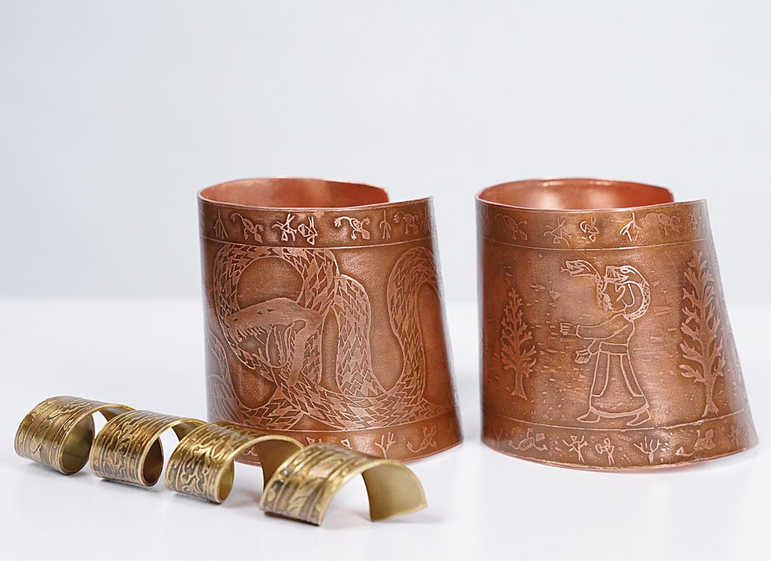 سمت دیگر ست نقالی شامل دو مچبند و دسته چوبدستی نقوش الهام گرفته از نبرد خیر و شر و درخت سرو هستند جنس: مس و برنج تکنیک: اچینگ