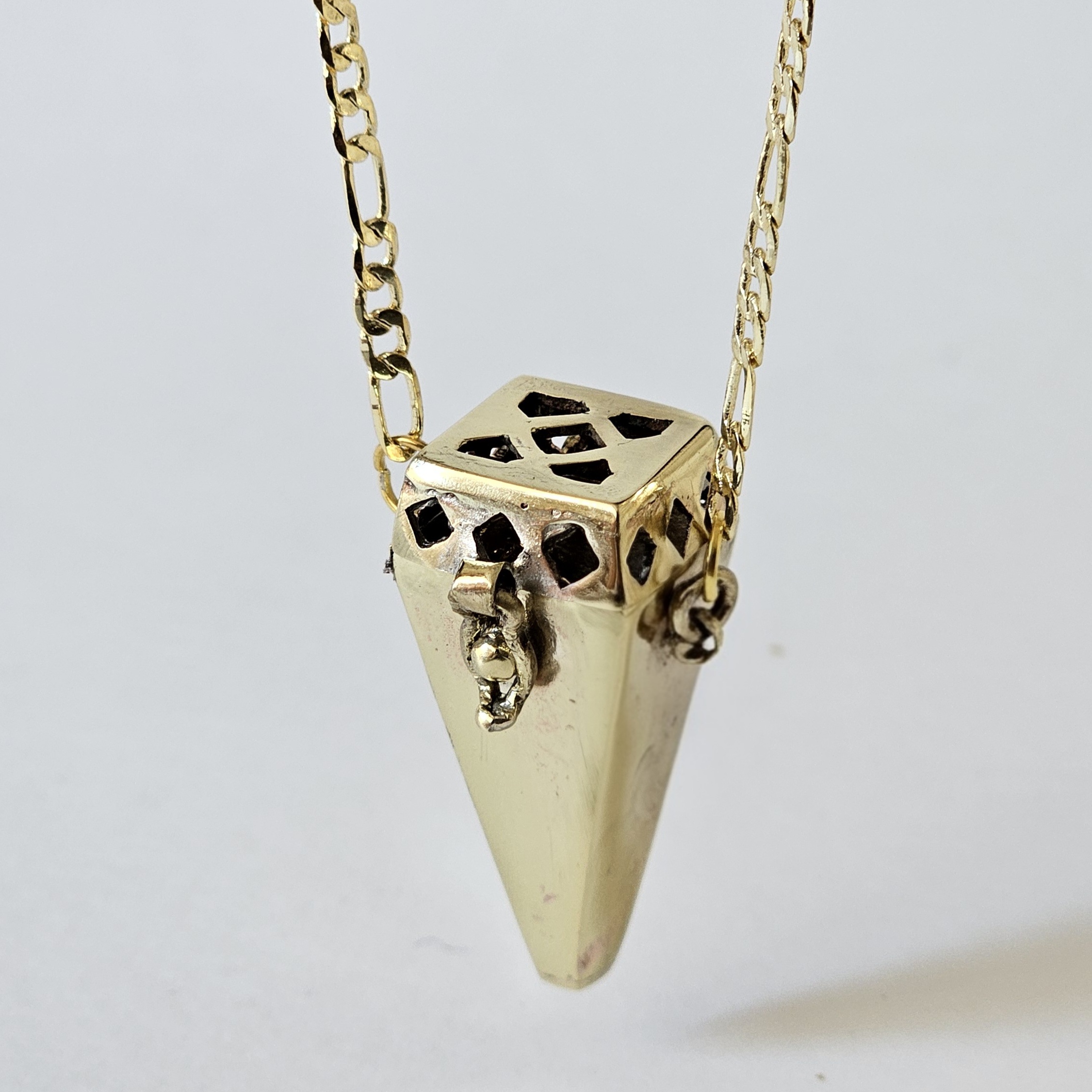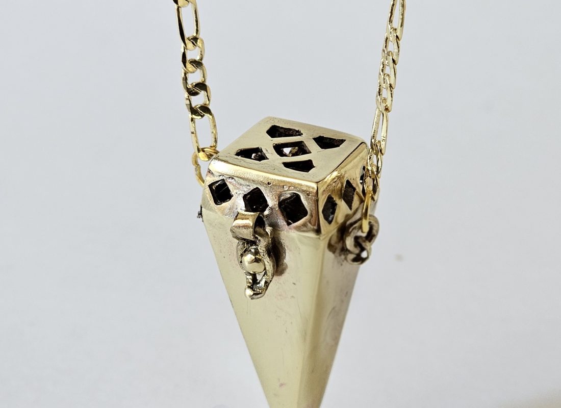 Description: آویز برنجی که در آنها فرمهای مخروطی و کشیده دیده میشود. این فرمها بهویژه با استفاده از حجمهای چندوجهی، جلوهای شیک و معماریگونه دارند. استفاده از فرمهای حجمی و معماریگونه کاملاً حس سازههای معماری را دارند. این ایدة «جواهر به مثابه یک ساختمان کوچک» از مشخصههای آرتدکو است، چون طراحان آن دوره هم به الهام از آسمانخراشها و برجها علاقه داشتند. آویزی با فرم منشوری چهار ضلعی همراه با شبکه مربعی شکل در جعبه که این فرمها حجمهای زاویهدار آرتدکو را تداعی میکند.