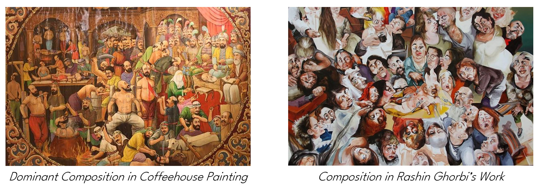 The main point of divergence between coffeehouse painting and Rashin Ghorbi’s creations lies in the use of hierarchical perspective, which is prevalent in traditional coffeehouse art.