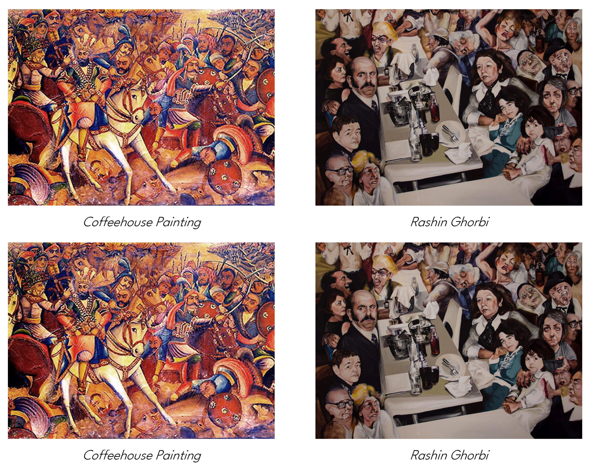 At its peak, Rashin Ghorbi’s pieces can be compared to the pinnacle of coffeehouse painting, and this comparison is precisely what is presented here as an example.